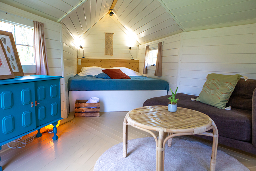 Ein kleines Wohnzimmer, ein großes Doppelbett mit Bettwäsche,