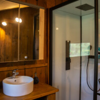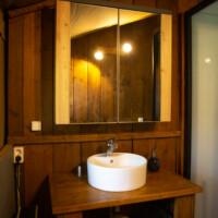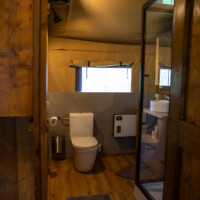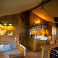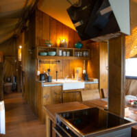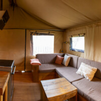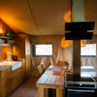 De tent heeft een keuken, badkamer, woonkamer en zithoek naast de tent.